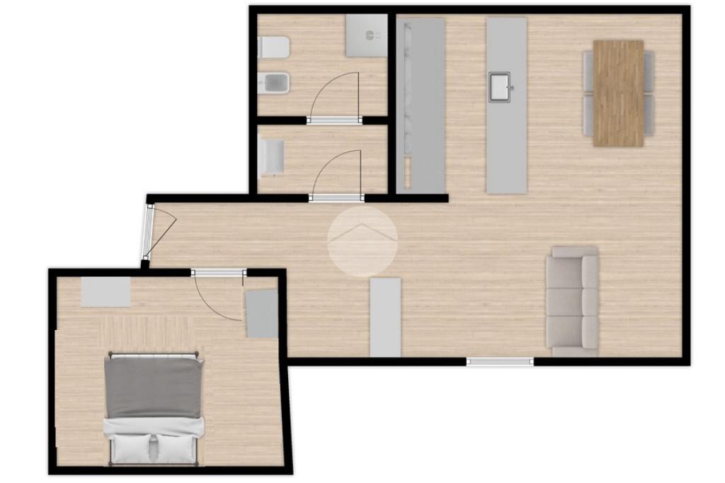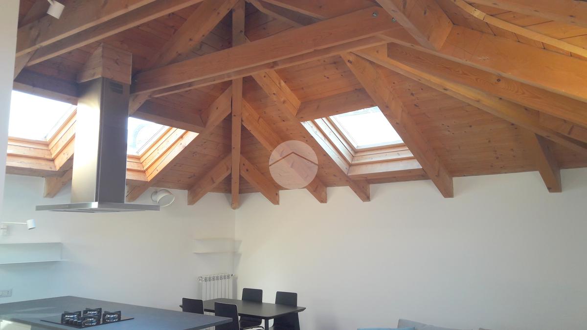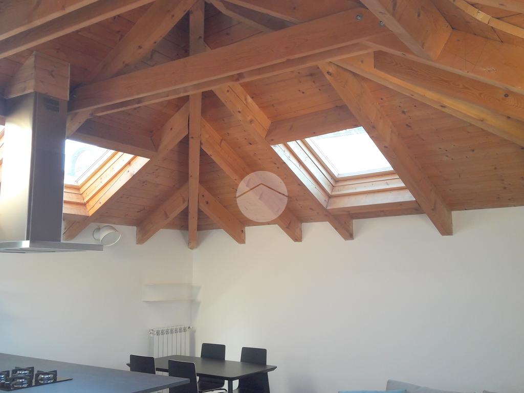 Caratterizzato dal tetto in legno, con punti bassi, si compone di ingresso nel corridoio, ampia zona giorno con cucina a vista, camera da letto (con piccolo armadio) e bagno.